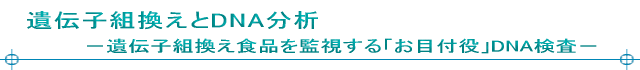 | はじめにDNA遺伝子 動植物や細菌の細胞の中には体を作り、生命活動を担う遺伝情報が書き込まれているデオキシリボ核酸(DNA)と呼ばれている物質があります。DNAはアデニン(A)、グアニン(G)、シトシン(C)、チミン(T)で表される四つの塩基などからなっていて二重ラセン構造をしています。DNAに刻まれている遺伝情報(遺伝子)は、A、G、C、Tの4文字で表され、4文字の並び方(配列)が個々の遺伝子で違っています。 組換えDNA技術 DNAは生物の体を作り生命活動を担う設計図であるだけでなく、病気のかかりやすさなど生物の性質にも関係しています。組換えDNA技術は、病気に強いといったような遺伝情報を担っているDNAを生物に組み込んだり、細胞から取り出したDNAに手を加えて元の細胞に戻したりする技術です。 組換えDNA技術による植物の品種改良 私たちの先祖は、およそ1万年ぐらい前から農耕を始めました。農耕を始めた頃は、野生植物を栽培していましたが、やがて農作物の生産性を向上させるために野生植物の改良を行うようになりました。今までにいろいろな植物どうしを交配して、人に都合の良い品種を選抜することで、多種多様な栽培植物が作りだされてきました。 しかも、雄しべと雌しべを交配して良い品種を選抜する方法には、大きな弱点があります。それは、病気に強くて美味しいといったような性質をもった品種を作るまでに長い長い時間がかかることです。その弱点を補うために登場してきたのが「組換えDNA技術による品種改良」です。 まず、生物から病気に強い遺伝子を見つけ、その遺伝子だけを取り出します。そして運び屋DNAなどを使ってこの遺伝子を美味しいが病気に弱い品種の細胞に組み込み、その細胞を培養・増殖して病気に強くて美味しい品種だけを選抜します。DNAを操る技を使うことで、改良にかかる時間が大幅に短縮され、しかも目的の有用品種を効率良く作ることができるわけです。 遺伝子組換え食品の安全性評価 組換えDNA技術により品種改良された(遺伝子組換え)食品の場合、組み込まれた遺伝子によって新たに作られるタンパク質がアレルギーなどを引き起こさない安全なものであることを明らかにしておくことがなによりも重要となります。安全性の確認されていないものが国内で流通しないように厚生労働省は、食品衛生法に基づいて食品の安全性審査を義務化して表示基準を定めました。また、農林水産省はJAS法に基づく品質表示とその表示方法を決めました。これらの制度は平成13年4月から実施されています。 厚生労働省がこれまでに安全性評価の確認を行った遺伝子組換え食品はすでに30品目(大豆、とうもろこし、ばれいしょ、てんさい、なたね、わたなど)を超えています。その他に、世界では日持ちの良いトマト、ウイルスに強いパパイヤ、それに食品ではありませんが青いカーネーションなどの農作物が商品化されています。今後、さらにいろいろな遺伝子組換えした農作物が商品化されてくるでしょう。 国内で流通している遺伝子組換え食品は、全て輸入されたものです。そこで、流通食品の信頼性を確保するために、遺伝子組換え食品が使われているか、使われていても安全性を確認したものであるかを明らかにする必要性が生じます。遺伝子組換え食品は、外見から識別することができませんし、通常の理化学試験による食品中の成分分析でも一般食品と区別することは困難です。 でも、心配御無用、遺伝子組換え食品を識別する手だては生物の設計図であるDNAのなかにあります。遺伝子組換え食品には品種改良に使われた特別なDNAが組込まれているはずですから、品質表示の適合性や食品として安全性が審査済みなのか否かはDNA検査をすれば明らかにすることができます。 遺伝子組換え食品を監視する「お目付役」DNA検査 組換えDNAの検査には二つの方法があって、いずれの検査にもDNAを数億倍にも増やすことのできるPCR(遺伝子増幅法)という操作が使われます。その一つは遺伝子組換え食品だけにある組換えDNAをPCR操作で増やし、それを電気泳動(DNAを篩い分けることのできる方法)で検出し、遺伝子組換え食品であることを確認するものです。もう一つは、時間とともにDNAが増えていく様子を記録できるリアルタイムPCR装置を用いてDNAを増やし、組換え遺伝子が含まれている割合を測るものです。 さらに、どのような遺伝子が組換えられているのかを詳しく知りたい場合、DNAシーケンサ装置を使い遺伝子のDNAを解読します。DNAに書き込まれている遺伝情報はA、G、C、Tの4つの文字の配列で表され、それが代々受け継がれているわけですから姿・形に特徴があるように4文字の配列にも特徴があります。その配列を解読し、見分けることで遺伝子が識別できるわけです。 例えば、DNAシーケンサにより解読された病気に強い遺伝子の4文字の配列を、インターネットを使って米国立衛生研究所(NIH)にあるジーンバンク(世界中から集まる遺伝情報を貯蔵しているところ)に照会し