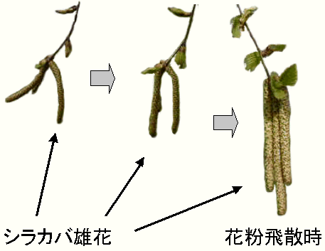 | シラカバ花粉は春とともに 北海道の冬も以前ほどは厳しく感じなくなってきましたが、それでも春は待ち遠しいものです。ゴールデンウイークが近づく頃には屋外でも過ごしやすくなり、冬の間にはあまりできなかった散策や、草花や野鳥の観察、花見、山菜採り、屋外スポーツなど、さまざまな目的で多くの人が一斉に野山や公園に繰り出します。 しかし、シラカバはゴールデンウイーク前から6月の初め頃までの期間、花粉を風に乗せて飛散させるのです。シラカバの花粉は直径が1ミリメートルの40分の1前後で、3つの突起(花粉管口)を持つ特徴的な形をしています(図1)。シラカバの花粉を吸い続けると、これまでシラカバ花粉症の症状を示さなかった人でもある年から突然発症する恐れがあります。正確な患者数は把握できていませんが、北海道では最近シラカバ花粉症患者が増えてきていると言われています。シラカバ花粉症は北海道に限られたものと思われがちですが、世界的に見るとヨーロッパ北部やアメリカ北部などでも以前からあるものです。 図1 シラカバの花粉 シラカバ花粉症の症状 花粉症は花粉に含まれる特定の蛋白質が原因で起こるアレルギー疾患で、症状は、目の痒み、鼻水、くしゃみ、鼻詰まりなどです。シラカバ花粉症患者の何割かは果物過敏症を併発し、リンゴ、サクランボ、キウイ、梨、桃、イチゴ、メロン、プラム、柿などを食べると口の中が痒くなったり、重症になると吐いたりすることがあるといわれています。 北海道立衛生研究所の取り組み 衛生研究所では1996年から空中のシラカバ花粉の観測を開始し、現在では保健所の協力を得て道内主要5都市(札幌、帯広、北見、旭川、函館)で観測を行っています。5都市の中では、シラカバ花粉が最も多く飛散するのが札幌で、旭川、北見、帯広、函館と順に少なくなっていく傾向がありました。なお函館ではスギ花粉も多く飛散するため、スギ花粉の観測も行っています。北海道の主な花粉症は、4月下旬〜6月上旬のシラカバ花粉症、5月下旬〜7月上旬の牧草(イネ科)花粉症、8月下旬〜9月前半のヨモギ花粉症です。上記以外の花粉(イチイ、マツ等)についても札幌では調査を行っています。これらの観測・解析結果は「花粉情報」として当所のホームページ(http://www.iph.pref.hokkaido.jp)で提供しております。 飛散開始日の予測 花粉症の症状を抑える抗アレルギー薬の中には、花粉が飛散する2週間以上前から服用すると効果を発揮するものもあり、それらの薬で花粉症の症状を抑えるためには花粉の飛散開始日を知ることが重要です。シラカバ花粉の飛散開始日は4月中旬〜5月上旬頃ですが、3月が暖かいと飛散開始が早まる傾向が認められることがわかってきました。3月が例年よりも暖かい年には、早めに抗アレルギー薬を服用する方が良さそうです。 総飛散量の予測 シラカバの雄花は、花粉を飛散させる前年の夏頃に形成されます。これまでの観測から、花粉飛散量は前年の夏の日照時間や全天日射量に左右される傾向が認められることがわかってきました。それによって、夏の日照時間や全天日射量から翌年のシラカバ花粉の飛散量が大まかに予測できるようになりました。 本州、四国、九州では、スギ花粉の飛散量予測は、「2004年は少ない」と報道されていますが、残念ながら北海道のシラカバ花粉飛散量は平年より多くなりそうです。シラカバ花粉症の人にとってはつらい春になるかもしれません。 昨年の天候は異変続きでした。春は気温が高い日が続き、6月からは一転して冷夏になり、秋には気温が上がり、11月3日には札幌で22℃と過去127年間で最も高い気温になりました。花粉の飛散量の予測は気象条件を基に行われます。この「異常気象」が予測にどのような影響を及ぼすか関心のあるところです。 シラカバの雄花は夏に枝先に2〜4本ずつ形成されますが、落葉後はより確認しやすくなります。北海道立林業試験場が行ったシラカバの雄花数調査の結果は、私たちの気象条件に基づいた予想結果を裏付ける「例年よりも雄花の数が多い」というものでした。また、同試験場ではアレルギーの原因物質が少ないシラカバの開発研究を行っていますので、将来は公園木や街路樹に花粉症の原因になりにくいシラカバが植樹されることが期待されます。 日々の飛散量の予測 4月の中旬以降は、暖かい日が数日続くと本格的なシラカバ花粉の飛散が始まる可能性が高くなります。シラカバの雄花は、最初は上を向いていますが、花粉の飛散が始まる数日前から大きくなりながら垂れ下がります。そして、シラカバの若葉はその頃顔を出します。そして、最初は閉じている若葉が開いたころに花粉が雄花から放散され始めます(図2)。このことを知っておくと、それぞれのシラカバの木に近づかなくても離れたところから花粉の放散状況を大体判別できるので便利です。シラカバ花粉の飛散量は、気温に連動して大きく変動する傾向があるこ とがこれまで