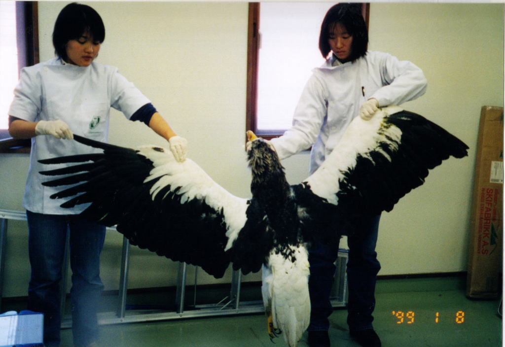 | 重症急性呼吸器症候群(SARS)や鳥インフルエンザの流行など、野生生物が人の健康や経済活動に重大な影響を及ぼす出来事がここ1〜2年相次いで発生しています。一方で人間の活動が野生生物にさまざまな影響をもたらし続けています。野生生物の異変は生態系の撹乱にとどまらず、やがて人の生活の豊かさに影響を及ぼすことが懸念されています。 原野を闊歩するエゾシカや冬季に飛来するオオワシ・オジロワシは北海道の自然の豊かさを代表するような野生生物です。ところが1990年代後半から、エゾシカ猟に用いられた鉛弾が原因で天然記念物の希少ワシ類が鉛中毒で相次いで死亡しています。なぜこのようなことが起こっているのでしょう。 エゾシカ生息数の急増と農林業被害 エゾシカは明治初期の大雪と乱獲により絶滅の危機に瀕しましたが、保護政策とその後の生息環境の改変もあって急激に個体数を回復しました。自然増加率は年間16〜21%と言われています。積雪が少なく冬季の重要な餌であるクマザサとミヤコザサが多い道東を中心に分布していますが、1990年代には食害による農・林業被害や自然生態系の破壊が顕著になり、1996年度の被害額は50億円にも達しました。このため北海道はエゾシカ対策として個体数管理、農林業被害防止、シカ肉の有効活用などに取り組んでいます。これに伴い銃猟による捕獲頭数は年間数万頭に急増しました。 オオワシ・オジロワシの生息数と越冬地域 オオワシは総個体数5000〜6000羽、越冬のため日本に渡ってくる個体は1500羽程度と見積もられています。翼前部、脚、尾羽の白と体全体の黒とのコントラストが美しく、黄色の嘴も鮮やかです。オジロワシはつがい数5000〜7000と推定され、北海道に約60の営巣地が確認されています。両種とも翼を広げると2メートル以上にもなる大型のワシ類で、オオワシは絶滅危惧U類(絶滅の危険が増大している種)に、オジロワシは絶滅危惧TB種(近い将来における絶滅の危険性が高い種)に指定されています。これらのワシは海ワシ類と呼ばれるように、サケやタラなどエサの多くを海に依存し、1990年代前半にはほとんどが沿岸部で越冬していました。 ワシ類の鉛中毒と鉛の由来 1997年1月頃から、オオワシやオジロワシの死体が道東の内陸部で見つかるようになりました(写真)。これらのワシ類の肝臓や腎臓の鉛濃度は通常の数百倍も高く、胃の中からエゾシカの体毛と金属片がしばしば出てきました。この金属片はカモ猟等で使用される鉛散弾粒とは異なるもので、ライフル弾の鉛破片であることが判明しました。エゾシカ体内を貫通した場合でもライフル弾の破片がエゾシカ体内に留まることも確認され、ワシ類はエゾシカ残滓を食べた結果、鉛中毒を発症したことが明らかになりました。エゾシカの捕獲頭数は毎年数万頭であり、回収されずに放置される個体が相当数あるのが実情です。いわば"内陸部の冷蔵のエサ"が海ワシ類の採餌行動に変化をもたらしたのです。ところでワシ類は胃の中の未消化物をペリットとして吐き出すため、鉛中毒で死亡した個体の胃から鉛片が検出されないこともしばしばあり、確定診断のためには肝臓などの鉛濃度を測定する必要があります。 ![]() 収容されたオオワシ 鉛弾の使用規制 北海道では1998年の狩猟期間の前に、鉛が飛び散らないフェイルセーフ型のライフル弾や純銅弾への切り替えの指導、エゾシカの回収ステーションの設置などが行われました。2000年にはエゾシカ猟における鉛ライフル弾が使用禁止に、2001年には大型獣用の散弾銃で用いられる鉛スラグ弾などもエゾシカ猟で使用禁止になりました。素早い行政対応と言えます。しかしながら、1997年以降ワシ類の鉛中毒死は、判明しただけで110羽以上に達しました。アメリカにおけるハクトウワシの鉛中毒死と比較しても顕著で、世界で最も高い密度で希少ワシ類の鉛中毒が発生してしまったことになります。 この間、ワシ類の鉛中毒を防止するためのNGOが組織され、ワシ類の被害の実態把握、非鉛弾の普及、放置されたエゾシカ残滓の回収などに貢献しています。当所も鉛汚染の実態把握に積極的に取り組んできました。環境省、北海道、NGOの連携によりワシ類の収容から死因の解明までのルートがほぼ確立されるとともに、猟友会の協力を得て未然防止のための努力が払われています。 しかしながら、エゾシカ猟における鉛弾の使用が全面的に禁止されてから3シーズン目となる2003-2004年の飛来期にもオオワシ・オジロワシの鉛中毒死が確認されています(3月10日現在6羽)。また、被害はオオタカやクマタカといった希少猛禽類にも広がっています。鉛弾が依然としてエゾシカ猟に使用されていると考えざるを得ません。こうしたことから、規制を徹底するためにヒグマ猟についても鉛弾の使用規制を拡大することが検討され始めています。また、エゾシカ猟で顕在化したワシ類の被害が国内の他の希少種で顕在化しないうちに全国レベルで対策を立てる