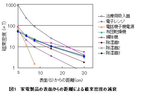 身の回りの電磁界の強さ 私達は、平成12年度から14年度までの間に、札幌市内の13世帯に協力を得て、居住環境における様々な家電製品の磁界の強さ、すなわち磁束密度の調査を実施しました。磁束密度の単位はテスラですが、通常はマイクロテスラを用います。 35種類87製品の家電製品の表面について測定した結果、1〜10マイクロテスラのものが、テレビ、空気清浄機、蛍光灯などで59製品、10〜50マイクロテスラのものが、ACアダプター、インターホン、洗濯機などで20製品、50〜100マイクロテスラのものが、電話機子機電源、布団乾燥機、除湿機などの7製品、100マイクロテスラ以上のものが、治療用吸入器の1製品となりました。 各製品は、機種ごとに幅があり、たとえば、掃除機、扇風機、ドライヤなどは、1〜10マイクロテスラの範囲に入っている機種もあれば、10〜50マイクロテスラの範囲に入っている機種もありました。また、磁束密度は、発生源からの方向や距離に依存するため、同じ表面でも箇所によって違います。今回の測定値は、人体に接する可能性が高くて最大の値を示すところとしました。 50マイクロテスラを上回った8製品の表面及びそこから離れた地点(各4,8,15,30センチメートル)における磁束密度の減衰曲線を図1に示します。家電製品との間に距離をおくことによって磁束密度は減衰しています。特に、治療用吸入器では、表面から30センチメートル離すことによって、920マイクロテスラから4マイクロテスラまで減衰しました。家電製品から発生する磁界による人体へのばく露量は、家電製品との距離を15センチメートル以上とることによって、大幅に軽減できることがわかりました。