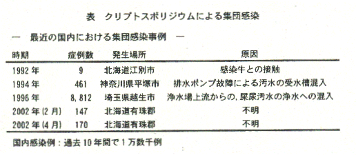 クリプトスポリジウムとは 水やナマ物等を摂取した際に感染する微生物の一つに、クリプトスポリジウム(Cryptosporidium)があります。クリプトスポリジウムは単細胞の原生動物(原虫) の一種で、これまでに7種類程が知られており、種類によって寄生する主な宿主が異なりますが、いずれも多種の脊椎動物の胃や小腸等の消化管粘膜細胞内部に寄生します。この中で人間にとって問題となるのは、主としてクリプトスポリジウム・パルプム(以下C.パルプム)であり、これは多くの哺乳類に感染することが知られています。 C.バルブムは腸管粘膜細胞内部で無性的に増殖し、やがて有性生殖により4個の虫体(スポロゾイト)が入ったオーシストと呼ばれる球状カプセルを生産し、これが糞便と共に排泄され、水系に混入する機会を得て感染源となります。水系に混入したオーシストが数個から数十個生体内に入ると新たな感染が成立し、4〜8日の潜伏期間を経て、激しい下痢、腹痛及び吐き気等の症状(クリプトスポリジウム症)が現れます。症状は1〜2週間程継続することがあり、この間大量のオーシストが糞便中に混入し、排泄されます。また、症状が治まっても(自然治癒)、1ヵ月程度はオーシストが排泄され続ける場合があります。一方、免疫機能が低下している人(エイズウイルス感染者等)や免疫抑制治療を受けている人では重症化することがあり、極度の脱水による死亡例もあります。しかし現在のところ、C.パルプムに対する有効な治療薬やワクチンはまだ開発されておりません。 集団感染 水道水によるC.パルプムの集団感染は、1980年代より欧米で報告され始めていましたが、わが国においても十数年前から認められており(表)、これまで最大規模の事件は1996年に埼玉県の越生町で発生しました。この事例では、浄水場の上流に位置した屎尿処理場の汚水が浄水に混入したため、地域住民の約半数が感染しました。また、本道でも2002年に感染経路不明の集団感染が報告されています。海外では極めて大規模な集団感染が発生しており、1993年にアメリカのウィスコンシン州ミルウォーキー市ではC.パルプムに汚染した水道水により、地域住民の約1/4に相当する40万人以上が感染した事例(死者:400名)が知られています。