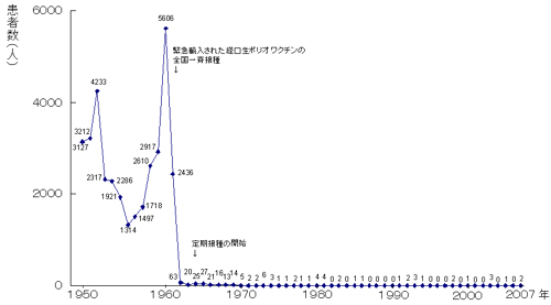 が、1950年代に開発されたワクチンによって患者数が大きく減少しました。我が国では、1980年を最後に野生株ポリオウイルスによる患者は認められて
