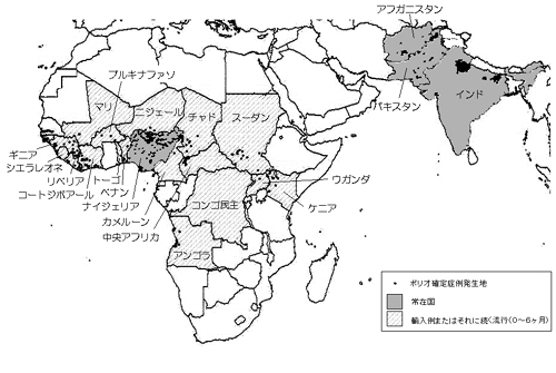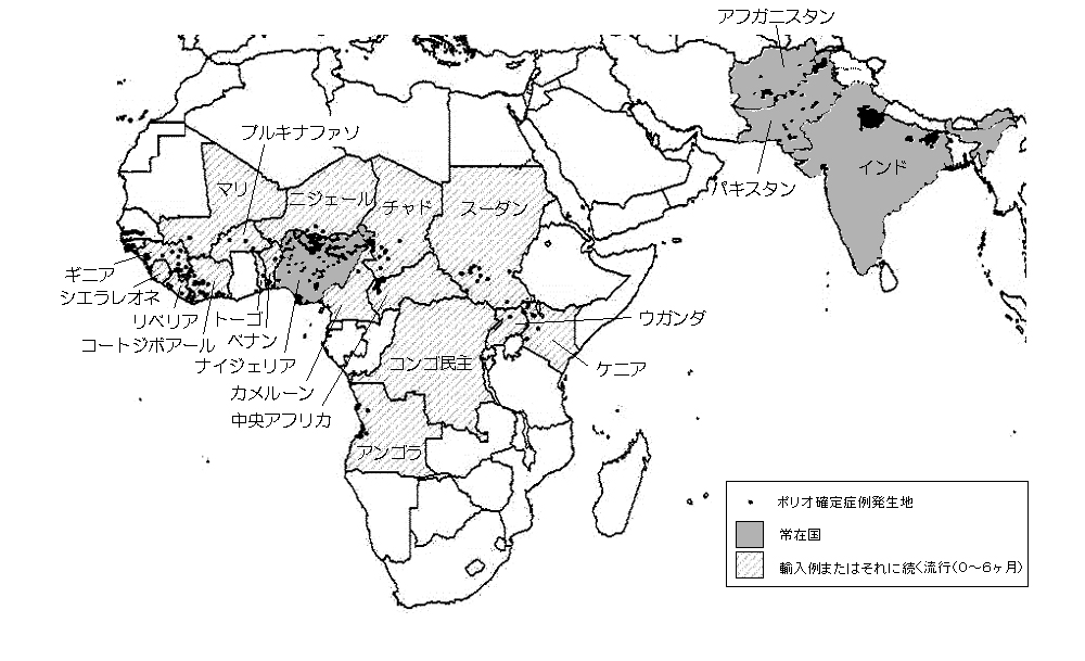 <拡大図はこちらをクリック> 現在、日本では生後3ヶ月から90ヶ月までの乳幼児に2回、経口生ワクチンの定期接種が行われています。ポリオウイルスには、I、II及びIII型の3 つの型が存在します。生ワクチンには毒性を弱めたこれら全ての型が含まれており、接種する(飲む)ことでそれぞれの免疫がつき、ポリオの感染を予防するこ とができます。現在、我が国のワクチンの接種率は95%を超えており、社会レベルの集団免疫状態にあると言えます。これによってポリオの大きな流行は回避 できますが、しかし、一人ひとりはどうでしょうか。厚生労働省は、ワクチンがきちんと効いているかどうか、流行予測調査事業のなかで国民のポリオに対する 抗体保有状況を調べています。それによると、概ね抗体を保有しているものの1975年(昭和50年)から1977年(昭和52年)生まれのヒトは、その大 多数がワクチン接種を受けたにもかかわらず他の年生まれのヒトよりもI型の抗体保有率が低いこと、またIII型の抗体保有率が他の二つの型よりも低いこと が明らかにされています。先にも述べましたがポリオは免疫を持っていない成人にも感染し発症します。従って、ワクチン接種の機会を逃したヒトはもちろんの こと、1975〜1977年に生まれたヒトは、あらためてワクチン接種を受けることが予防に大切なことと考えられます。ポリオのワクチンには、大きく分け て、毒力の弱いポリオウイルスを含んだ生ワクチンと感染性を失ったウイルス抗原による不活化ワクチンがあります。現在、国内で使用されているワクチンは、 I、II及びIII型の全ての型に対応した三価の生ワクチンです。海外では、不活化ワクチンやそれぞれの型に特化した単価の生ワクチンも使用されていま す。 ワクチン接種の徹底−地球規模の根絶作戦− 1988年、世界保健機関(WHO)は地球上から小児麻痺をなくすためポリオ根絶計画をスタートさせました。計画は、全ての国における患者の発見と徹底 したワクチン接種による流行拡大の阻止を戦略に、新たなポリオ患者の出現を絶とうとするものです。ポリオウイルスはヒトのみを宿主として増殖するため、ヒ トにおいて予防出来れば根絶可能というわけです。これによってアメリカ地域では1994年に、日本を含む西太平洋地域では2000年に、ヨーロッパ地域で は2002年6月にそれぞれの地域レベルでの野生株ポリオウイルスによる新規患者の根絶が宣言されました。しかしながら、これら以外の地域では今も患者発 生が報告されている国があります。2003年、全世界では784人の患者が報告され、そのうち355人はナイジェリアからでした。ナイジェリアにおける流 行は、国内の有力な宗教家や医師などによるワクチンに対する不信感が接種の中断を招いたためとされ、周辺諸国にも患者が波及する事態を引き起こしました。 2006年にはナイジェリアにおいて1122人、世界全体では1997人の患者が報告されており、2000年以降では最も多い年となりました。また、 2009年は、これまでにインド、パキスタン、ナイジェリア、アフガニスタンをはじめとする21カ国(図2)において総計1020人(9月22日暫定数) の患者が報告されています。 ![]() 図2【野生株ポリオウイルスによるポリオ発生国、2009年3月23日〜9月22日】(2009年9月22日付のWHO本部提供資料を一部改変) <拡大図はこちらをクリック> 特にI型やIII型の野生株ポリオウイルスによる患者が後を絶ちません。WHOは、これらの国において新たに患者が確認された地域を中心にワクチン接種 活動を実施しています。例えば2008年に559人の患者を出したインドの場合、2009年に入ってからもIII型野生株による発生がみられた北部では、 3月初旬にIII型に的を絞った単価ワクチンの集団接種を行い、翌4月と5月にはI型に対する単価ワクチンを、更に6月にもワクチンの集団接種を実施す る、といった具合に精力的な予防活動を行っています。 望まれる安全で安価な不活化ワクチン 生ワクチンは、弱毒とはいえ感染力を持ったポリオウイルスを用いて製造されています。そのため、生ワクチンの使用を続ける限りワクチン由来麻痺の危険性 が残ります。そこで、期待されるのは、感染性ウイルスを含まない不活化ワクチンの導入です。WHOは、野生株ポリオウイルスの伝播の世界的終息を確認した 後、弱毒株も含めたポリオウイルスの感染(生ワクチンによる感染も含まれる)を皆無にするため、生ワクチン接種を停止する方針を打ち出しています。全ての ワクチンが不活化ワクチンに移行されたならば、ワクチン由来麻痺の危険性もこれまで以上に軽減することが可能になるのです。しかし、不活化ワクチンの導入 には安全性の確立や製造コストの低減といった未解決の課題が残されています。今後我が国は、これらの解決を目指しつつ、世界的な状況もみながらポリオ対策 の指針を改めていく時期になると考えられます。 衛生研究所では、ポリオが疑われる患者が発生した 場合、そのヒトの糞便や髄液などを用いてウイル