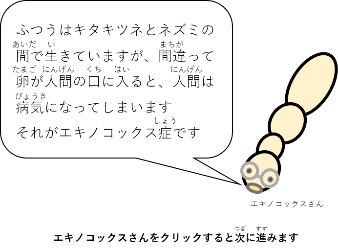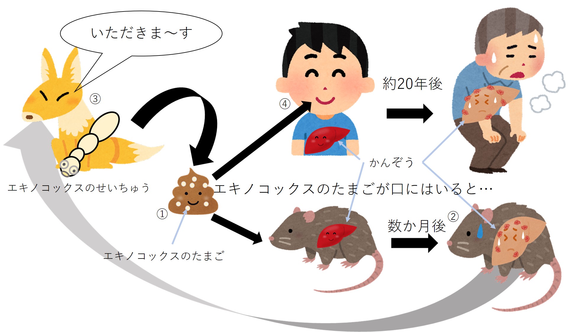 その成虫は、キツネの体内で卵を産み、それがキツネのウンチに含まれる(①)というサイクルを繰り返しています。