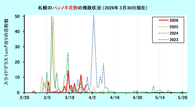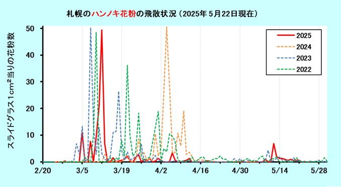 北海道ではハンノキは積雪の残る 3月から花粉を飛散させます。 ハンノキは、シラカバと同じカバノキ科に属する植物であり、共通の抗原性を有することから、シラカバ花粉症の人の中にはハンノキの花粉でも症状が出る人がいます。