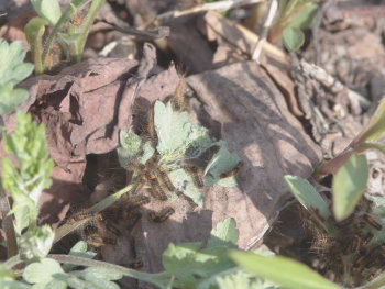 越冬直後も地面に近いところに幼虫集団がいるので見つけづらく、見逃す可能性も高くなります(右の図)。