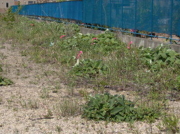 この公園は、四角形の敷地で、西側に雑草地があり、四方がハマナスの生け垣で囲まれており、中央部にバラなどが植えられた花壇があると想定します。