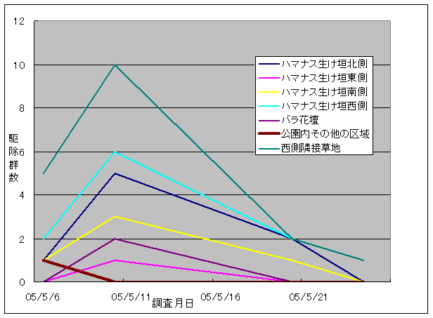 この図からは、5月6日の初回調査時は、時期が早すぎて発見群数が少なかった可能性があること、その後の駆除作業で5月24日の最終調査時にはほぼ駆除に成功していることが読みとれると思います(ただし、図はあくまでも理想例で、実際のデータではありません)。