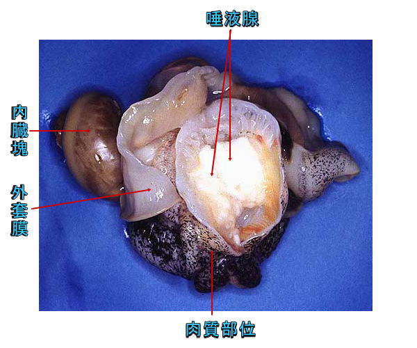 唾液腺の部位を示した写真(唾液腺、外套膜、肉質部位)